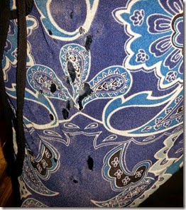 The blow dryer is becoming a huge problem. When mom is finished getting ready for the day (doing her hair and make up), she is often sweaty. Her solution is to stick the blow dryer under her shirt to dry herself off. Last Monday, I heard the blow dryer go off and I knew she had already done her hair, so I knew exactly what she was up to. I raced back to her bedroom to find the blow dryer under the back of her shirt. And this is what her shirt looked like: